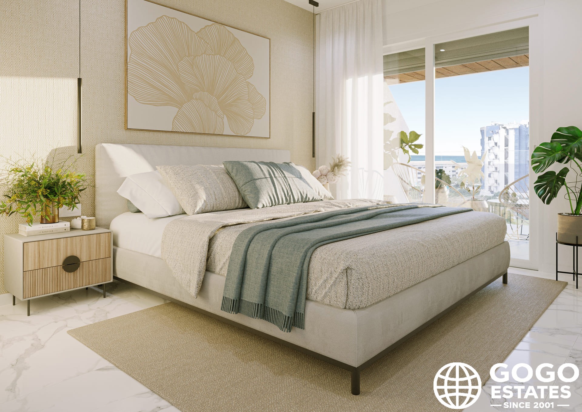 Outdoor areas are designed for relaxation, with a 22m² terrace perfect for enjoying the Mediterranean climate. The residential complex also offers a communal pool, jacuzzi, gym, and landscaped areas, enhancing the living experience.